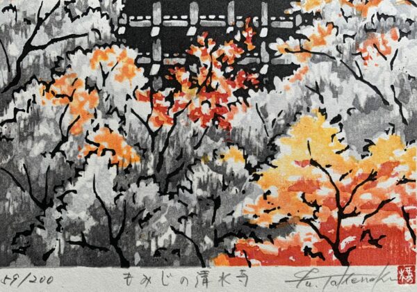 Original woodblock print – Fu Takenaka (b. 1945) – Kiyomizudera maple temple in Autumn- Signed and numbered in pencil by the artist 59/200 – Heisei period (1989-2019)
